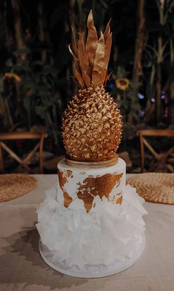 Ein Hauch von Tropen zieht sich durch den Sweet Table und setzt gezielte Akzente: Kleine, goldene Ananas-Sweets ergänzen hier das Tortenmotiv und bringen eine frische, exotische Note in das Dessertkonzept der Hochzeit. Die unterste Schicht der Hochzeitstorte ist mit zarten, weißen Rüschen verziert und verleiht dem Design eine elegante Leichtigkeit. Die mittlere Ebene zeigt eine kunstvoll gestaltete Weltkarte, auf der all jene Länder markiert sind, die das Paar bereits gemeinsam bereist hat – eine persönliche Geschichte, die sich auch im Sweet Table widerspiegelt. Als Abschluss thront eine vollständig goldene Ananas auf der Torte. Im Inneren ist sie mit Vanille-Biskuit, feiner Pistaziencreme und hausgemachter Orangenmarmelade gefüllt, während die filigranen Blätter aus Esspapier gefertigt sind.