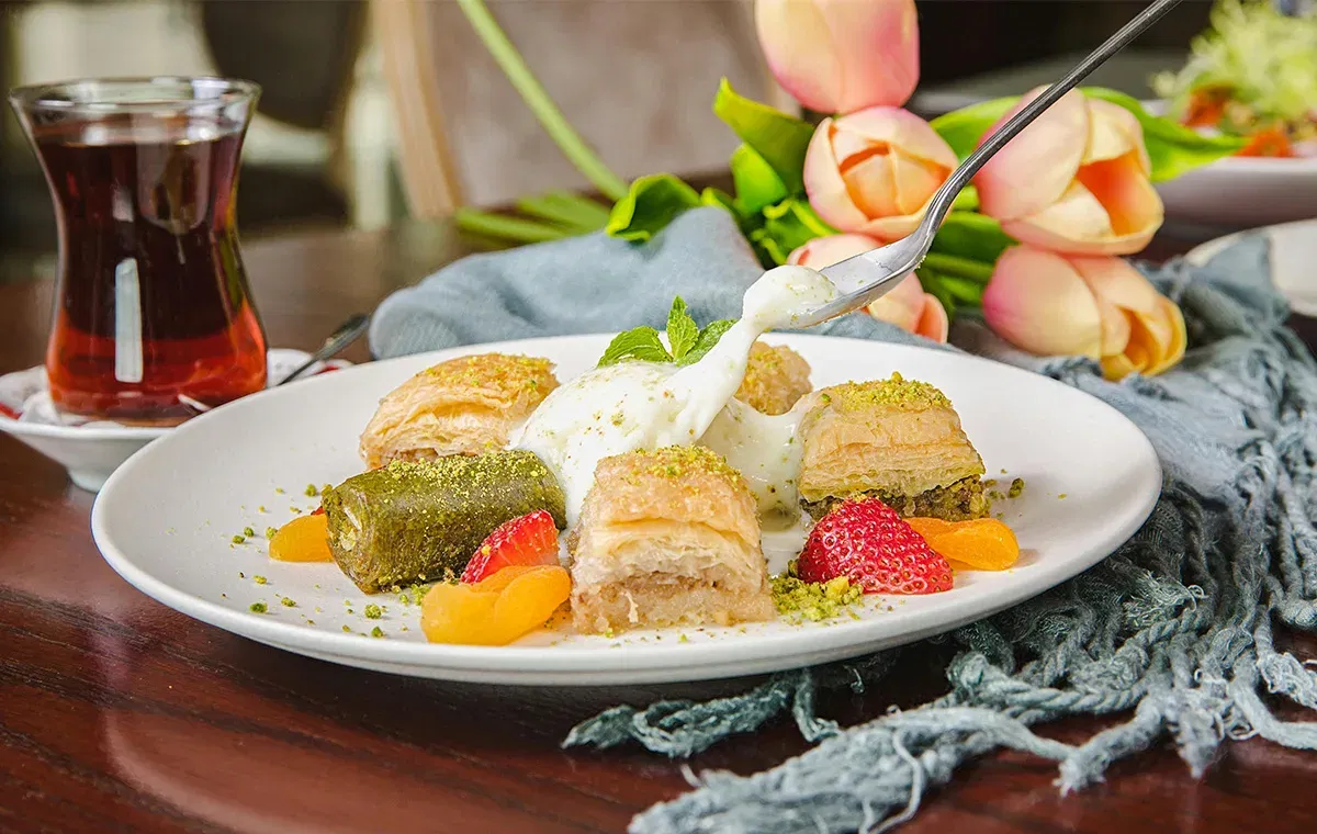 Für alle, die es besonders süß mögen, ist Baklava eine außergewöhnliche Wahl. Dieses Dessert besteht aus hauchdünnen Schichten von Filoteig, die mit Nüssen wie Walnüssen, Mandeln oder Pistazien gefüllt und mit Honig oder Zuckersirup getränkt werden. Das Ergebnis: knusprig, saftig und zudem unwiderstehlich süß.