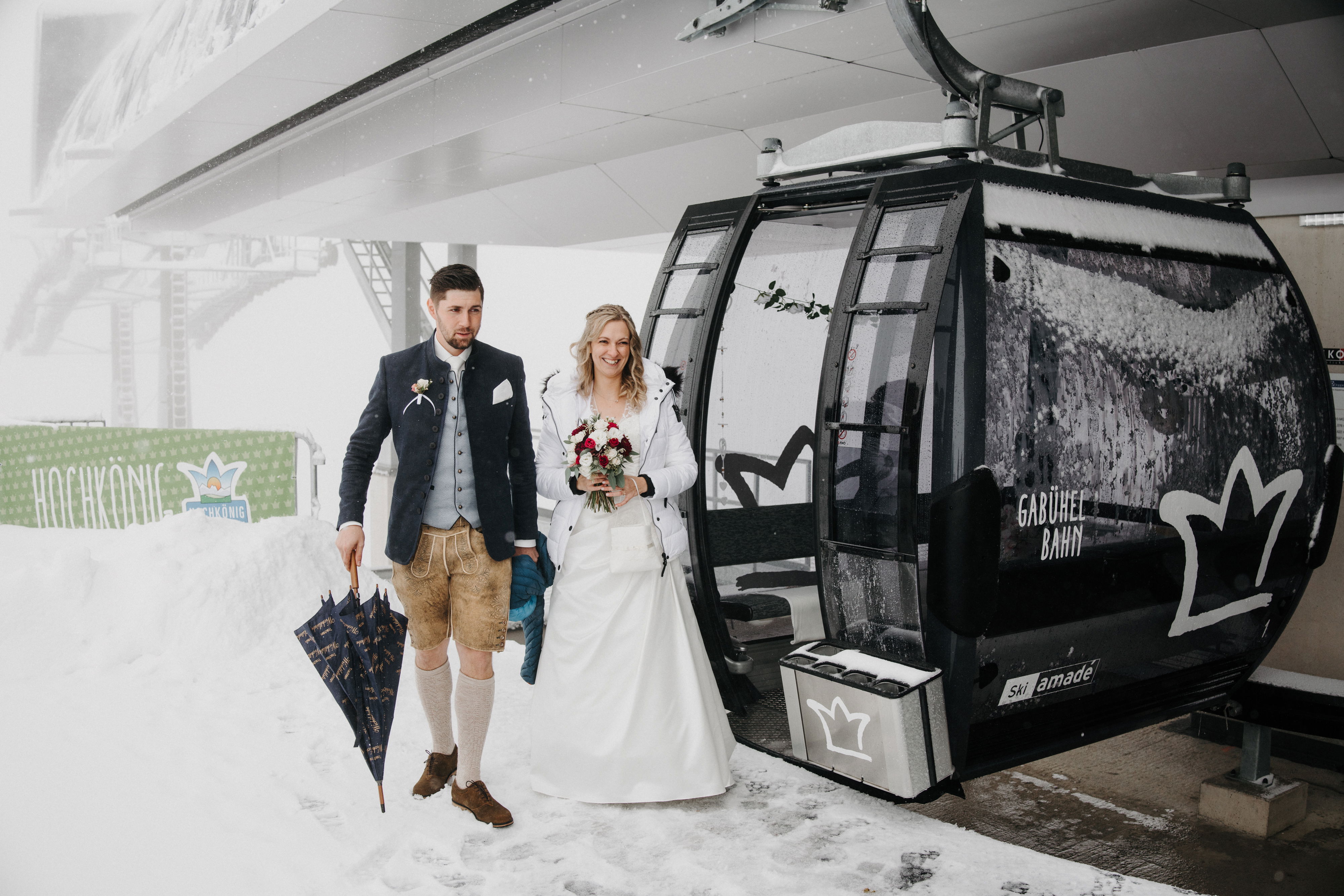 Fragt man die Eheleute nun nach den Höhepunkten der Hochzeit, reiht sich ein Highlight an das nächste. Neben der tollen Location, die nur mit der Bergbahn aus dem Tal erreicht werden konnte, war auch das Wetter selbst ein eher unfreiwilliges Highlight. Nach einer Schönwetterphase in den Bergen schlug das Wetter nämlich um und – siehe da – es begann überraschend zu schneien. Auf 1.700 Metern Seehöhe fielen große weiße Flocken während der Hochzeit hinab und schufen eine einmalige Atmosphäre. Weder das Brautpaar noch die Gäste ließen sich von dem unerwarteten Wetterumschwung abhalten. Bereits während der Gondelfahrt auf die Alm wartete ein Gläschen Sekt auf die Hochzeitsgesellschaft und die freie Trauung mit Traurednerin Manuela Scherzer selbst war ein einziges Highlight.