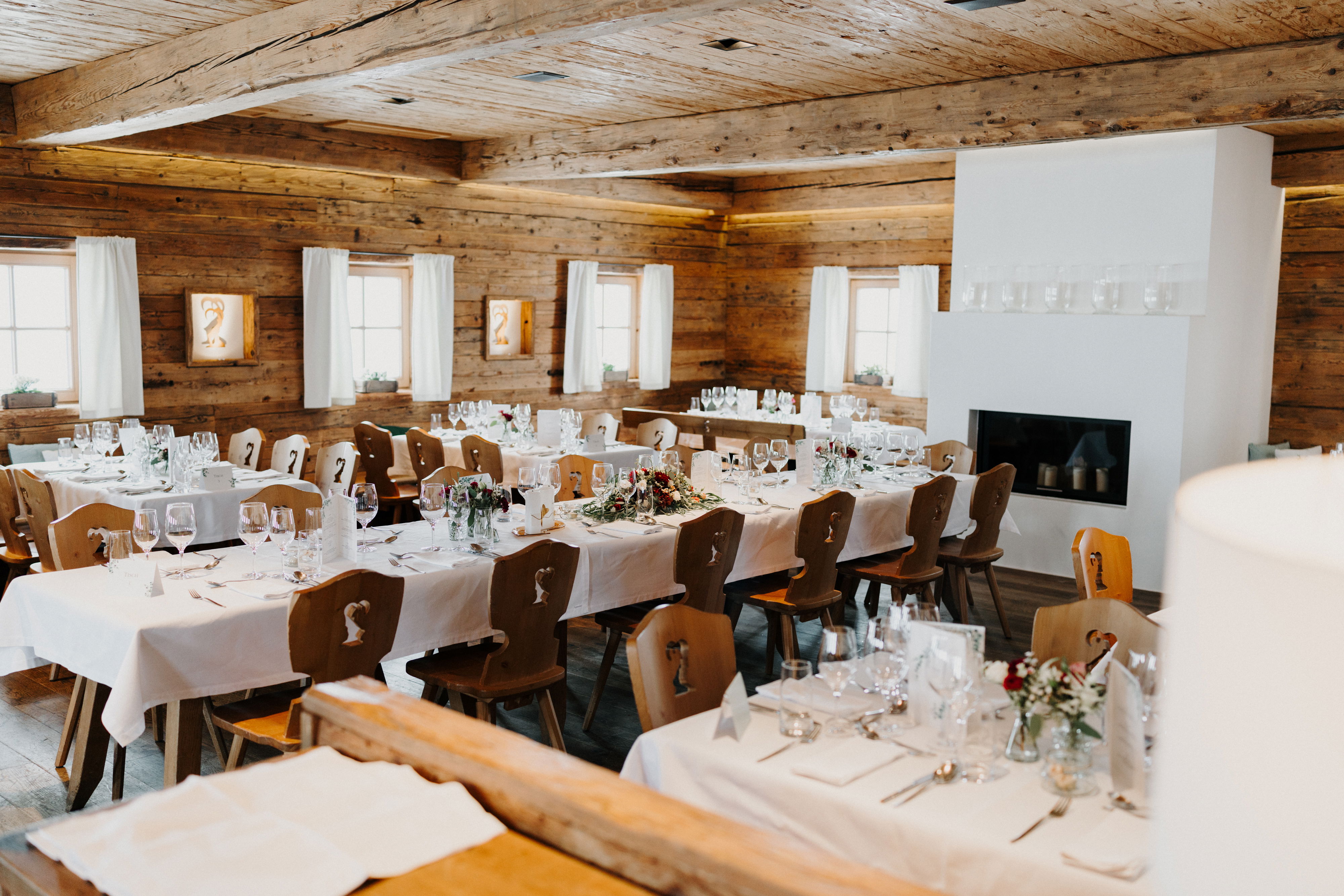 Die Trauung selbst stand, wie könnte es anders sein, unter dem Motto „Berghochzeit“ – mitsamt der passenden Traditionen wie dem Gipfelschnaps, den das Brautpaar, das am Berg von den Gästen mit tosendem Applaus empfangen wurde, mit Verwandten und Freunden trank. Letztendlich sorgte auch das Bergpanorama, das alle durch die gläserne Front der Steinbockalm genießen konnten, während sie wohlig warm am angezündeten Kamin feierten, für ein einmaliges Erlebnis in den Bergen Oberösterreichs.