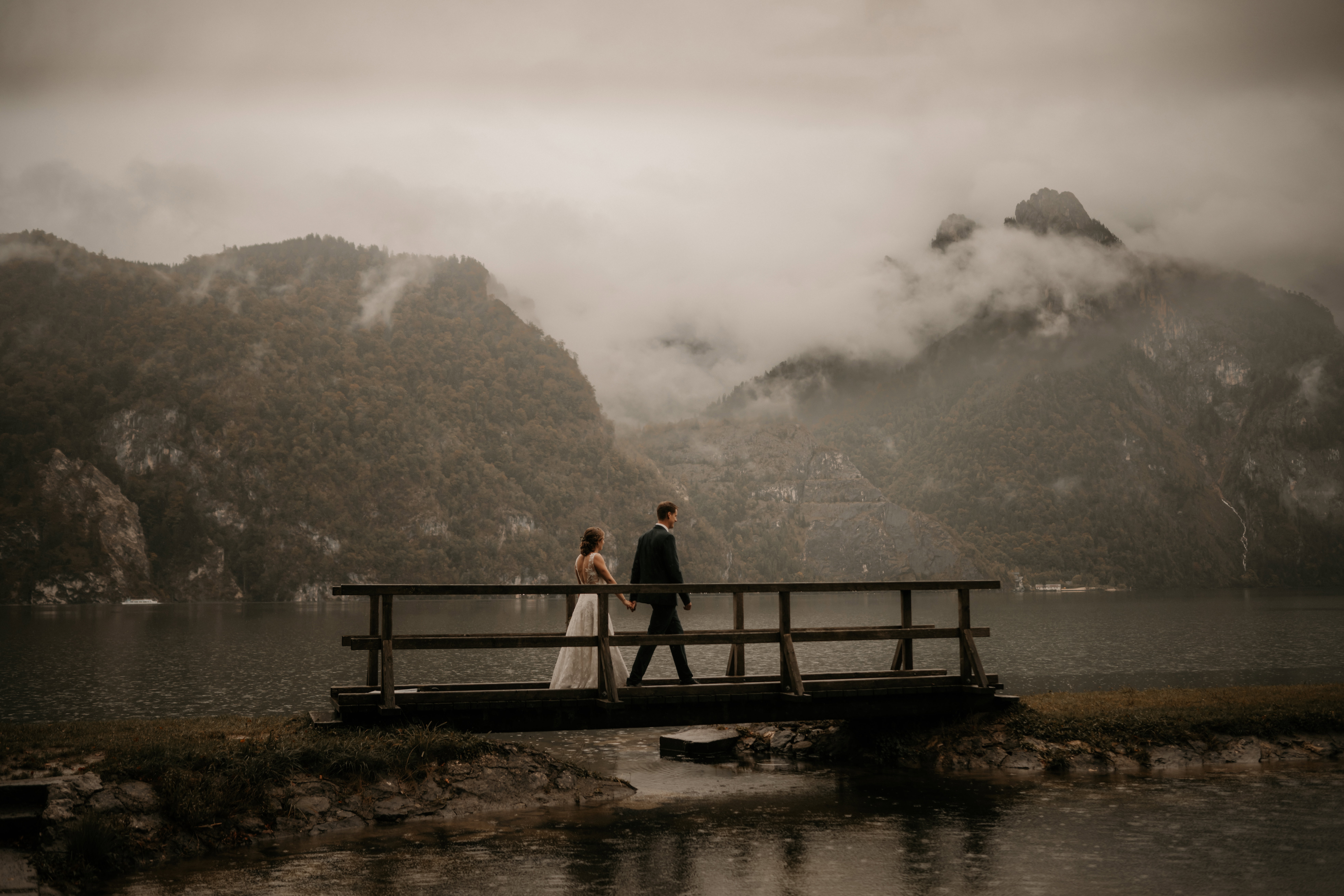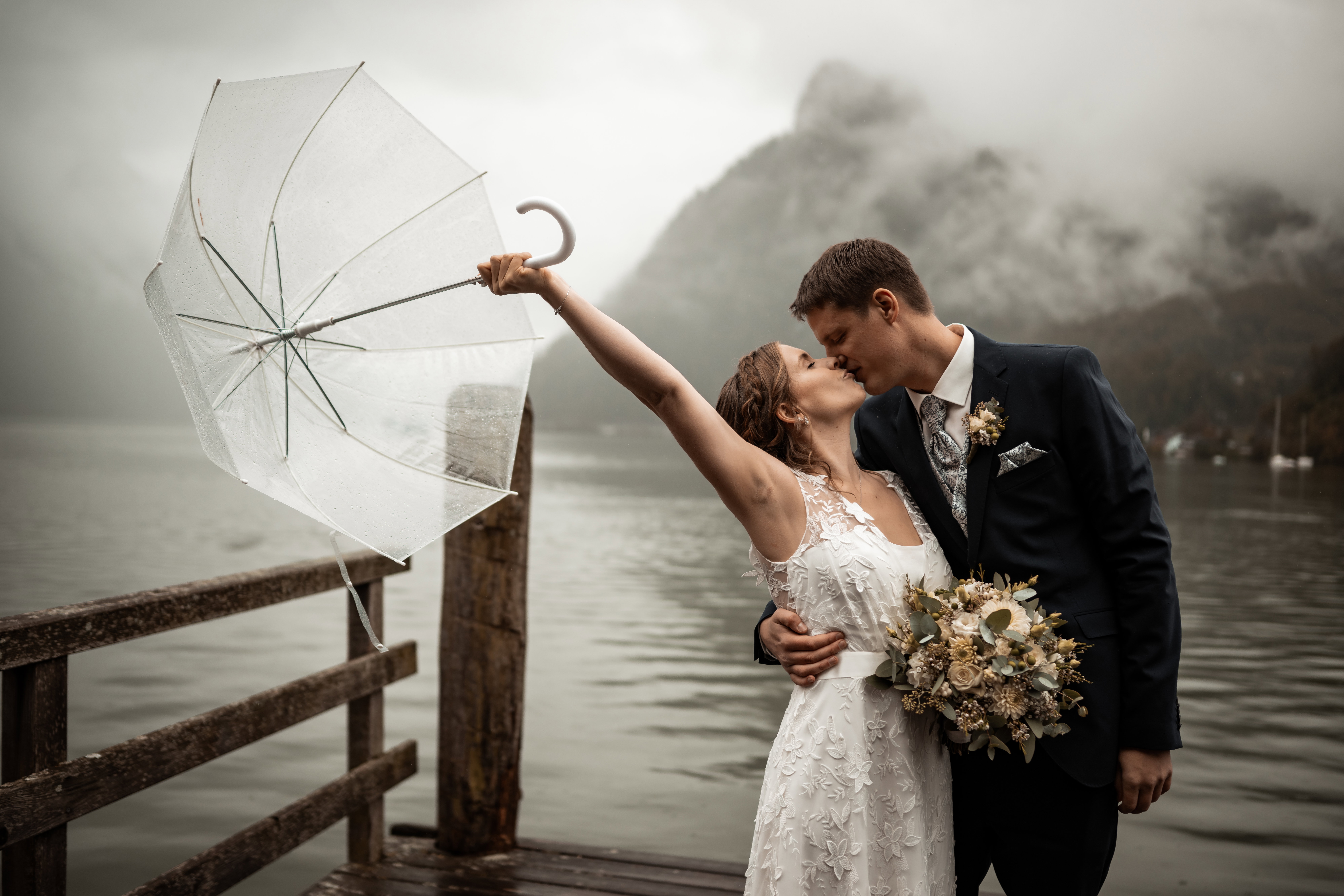 Am Hochzeitstag selbst spielte dann das Wetter einfach nicht mit und, obwohl das Brautpaar bis zuletzt gezittert und Wetter-Apps studiert hatten, war es regnerisch. Die Trauung fand dann im nahe gelegenen Stiftersaal statt, doch das Fotoshooting zu zweit draußen im Nieselregen am See. Gerade das verleiht ihren Fotos nun etwas Mystisches und, so Tanja, „Die Fotos sind einfach perfekt geworden, wir würden es heute nicht anders haben wollen.“