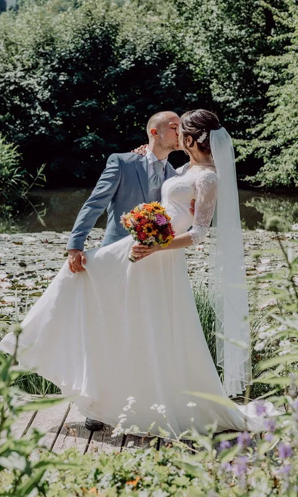 Maria und Bene entschieden sich, ihre Liebe gleich zweimal zu feiern: zuerst im kleinen Kreis, später mit all ihren Liebsten. Ihre standesamtliche Hochzeit fand im Juli 2023 auf der Herreninsel statt – ein Ort, dessen Termine heiß begehrt sind. „Am 2. November werden dort jedes Jahr die neuen Trauungstermine freigegeben“, erzählt Bene. „Wir haben wirklich lange probiert, überhaupt durchzukommen.“ Doch schließlich hatten sie Glück und sicherten sich ihren Wunschslot. Für die Feier auf der Herreninsel luden sie nur den engsten Familienkreis ein: Eltern, Geschwister und ihre Trauzeugen. „Wir waren ungefähr 20 Leute“, sagt Maria. Ein besonders rührender Moment: Ein paar von Benes Freunden erschienen völlig überraschend zum Spalierstehen. „Das wussten wir gar nicht. Das war so eine schöne Überraschung.“ Nach der Trauung ging es weiter auf die Fraueninsel, wo sie gemeinsam essen und den Tag entspannt ausklingen ließen. Die große Feier folgte ein Jahr später: Dann heirateten Maria und Bene kirchlich – diesmal mit rund 80 Gästen. Die Trauung fand in der Kirche auf der Baumburg statt. Gefeiert wurde anschließend in der „Angermühle“ im Ort Altenmarkt an der Alz.