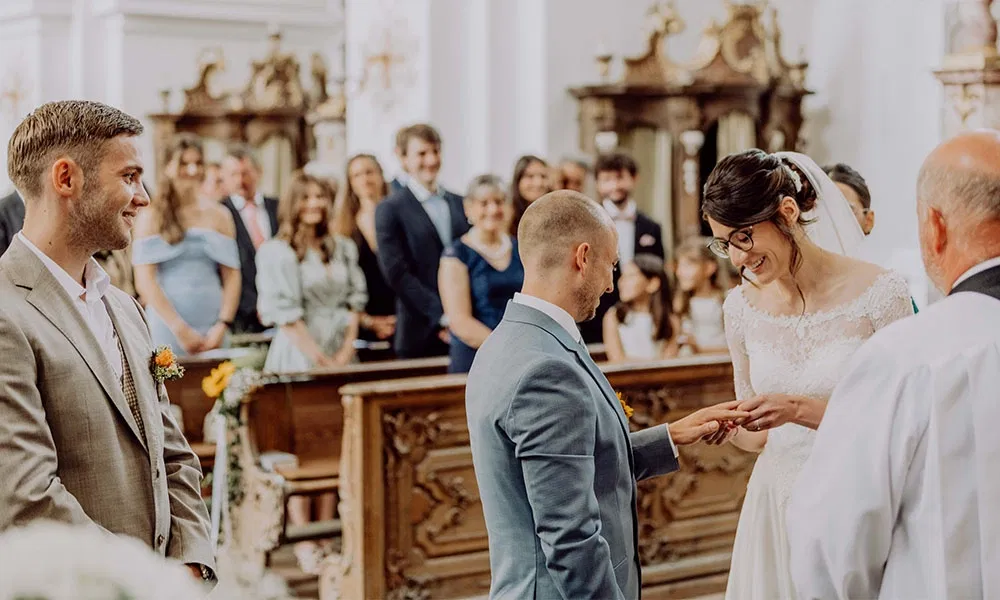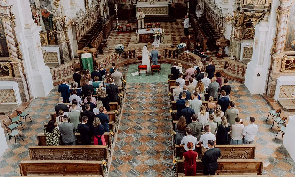 „Wir sind tatsächlich gemeinsam eingezogen“, erzählt Maria. Voraus gingen ihre kleinen Nichten, die als Blumenmädchen den Einzug anführten. Dahinter folgte das Brautpaar Seite an Seite. Für die musikalische Begleitung sorgte jemand ganz Besonderes: Marias Vater. „Er spielt Orgel in seiner Heimatkirche und hat sich unglaublich gefreut, dass er in der Baumburg an der Orgel sitzen durfte“, sagt Bene. Das Einzugslied war „Oh Happy Day“. Ein Auftakt, der nicht nur die beiden, sondern die gesamte Hochzeitsgesellschaft mitten ins Herz traf.