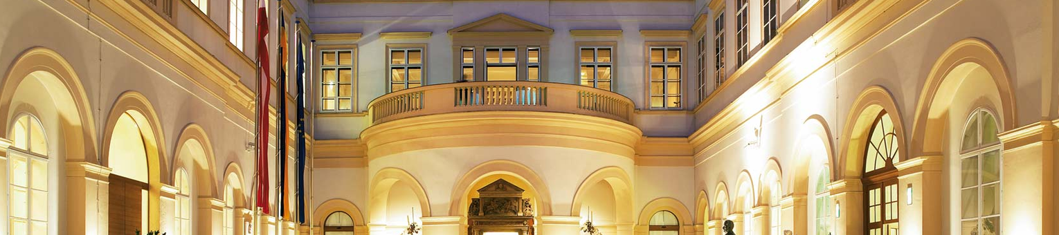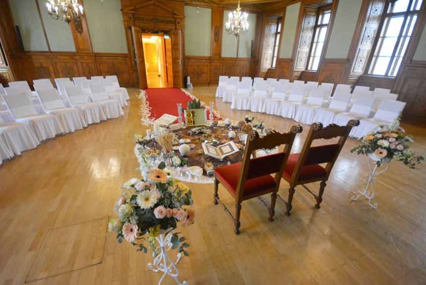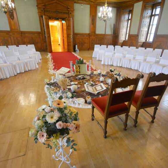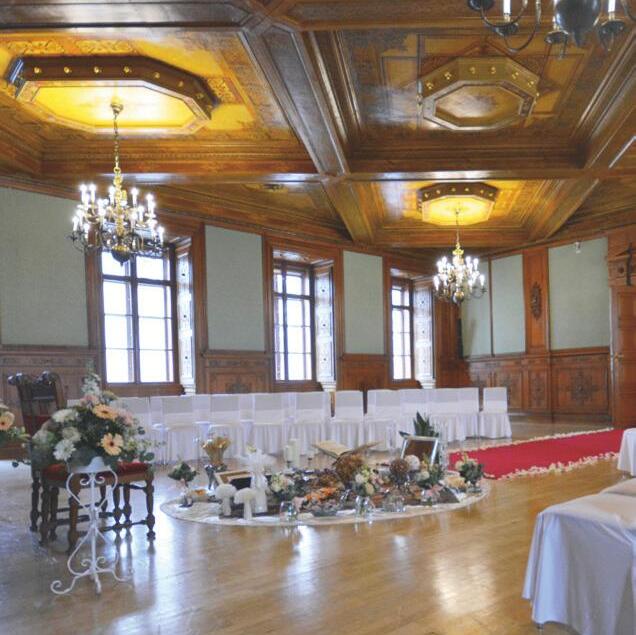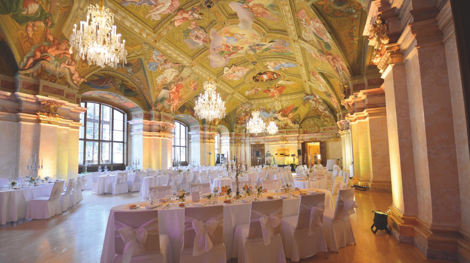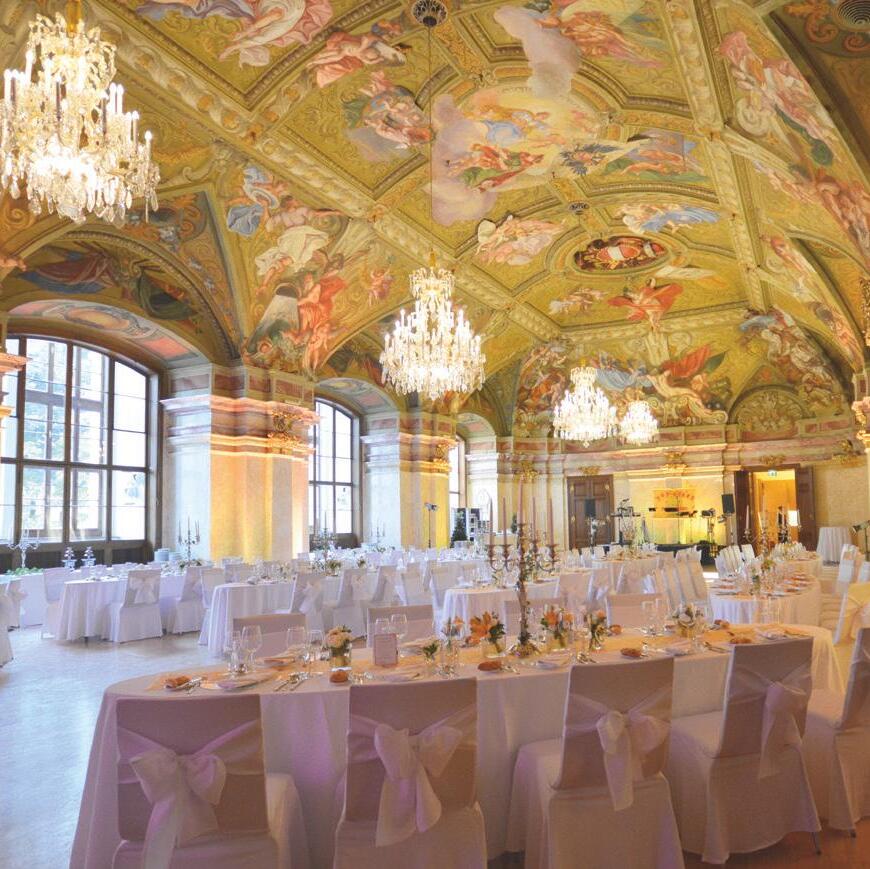 Gotische Zimmer als Entree bietet sich hervorragend für die Agape an. Wenn Sie mit mehr Gästen feiern, kann die Trauung im Herrensaal mit bis zu 100 Personen stattfinden. Genau gegenüber fasziniert der Rittersaal mit seinem Gold verzierten Baldachin, in dem die Feier weitergehen kann. Perfekt geeignet für die Agape ist das Foyer zwischen beiden Räumen. Im Rittersaal finden aber auch hervorragend Trauungen im großen Kreis statt. Mit bis zu 140 Gästen können ganz besondere Momente gefeiert werden. Für das Galadinner geht es dann weiter in den Landtagssaal, in dem bis zu 220 Personen Platz haben. Besonders beeindruckend sind hier das Deckenfresko, die Wände mit Stuckmarmor und die große Fensterfront, die den Saal erstrahlen lassen. Gerne können auch alle Räume kombiniert werden, sodass genügend Platz für die Trauung, eine Bar und die Tanzfläche