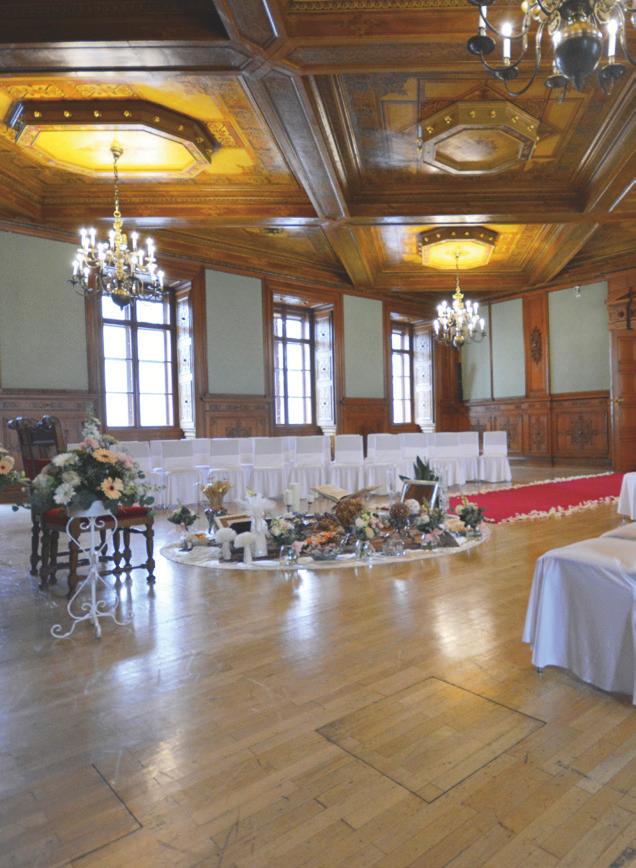 Trauung mit 60 Gästen stattfinden oder das Galadinner mit bis zu 40 Gästen. Die Holzvertäfelung und die Seidentapeten verleihen dem Raum seinen unvergleichlichen Glanz. Das