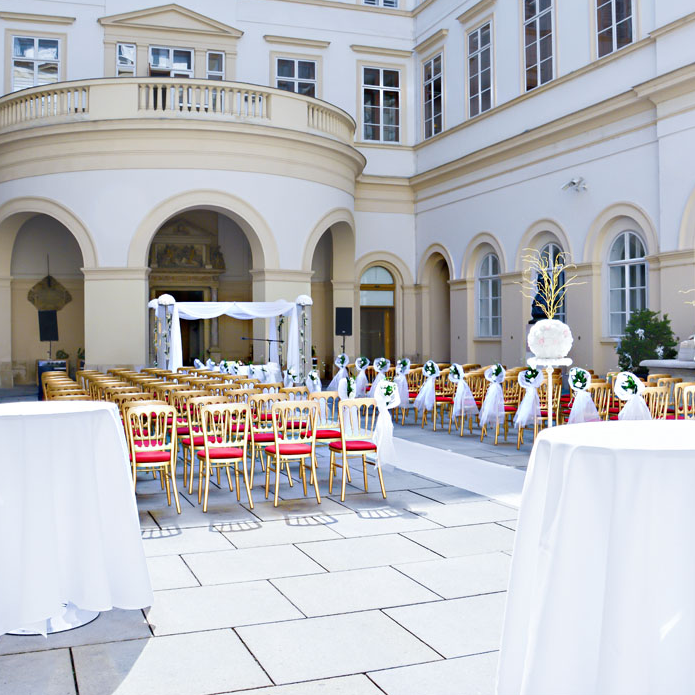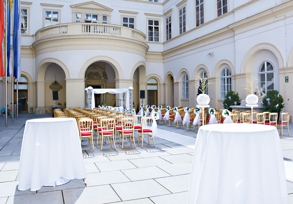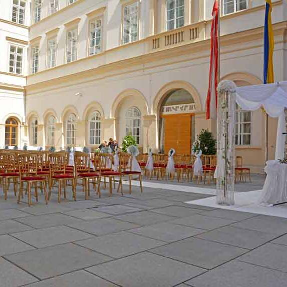 ist. Wer sich eine Trauung im Freien wünscht, ist im Palais Niederösterreich ebenfalls sehr gut aufgehoben. Mit bis zu 300 Personen kann der Innenhof für diesen emotionalen Moment genutzt werden. Vor prunkvoller Kulisse kann man den Stadttrubel vergessen und die Feier einfach genießen.