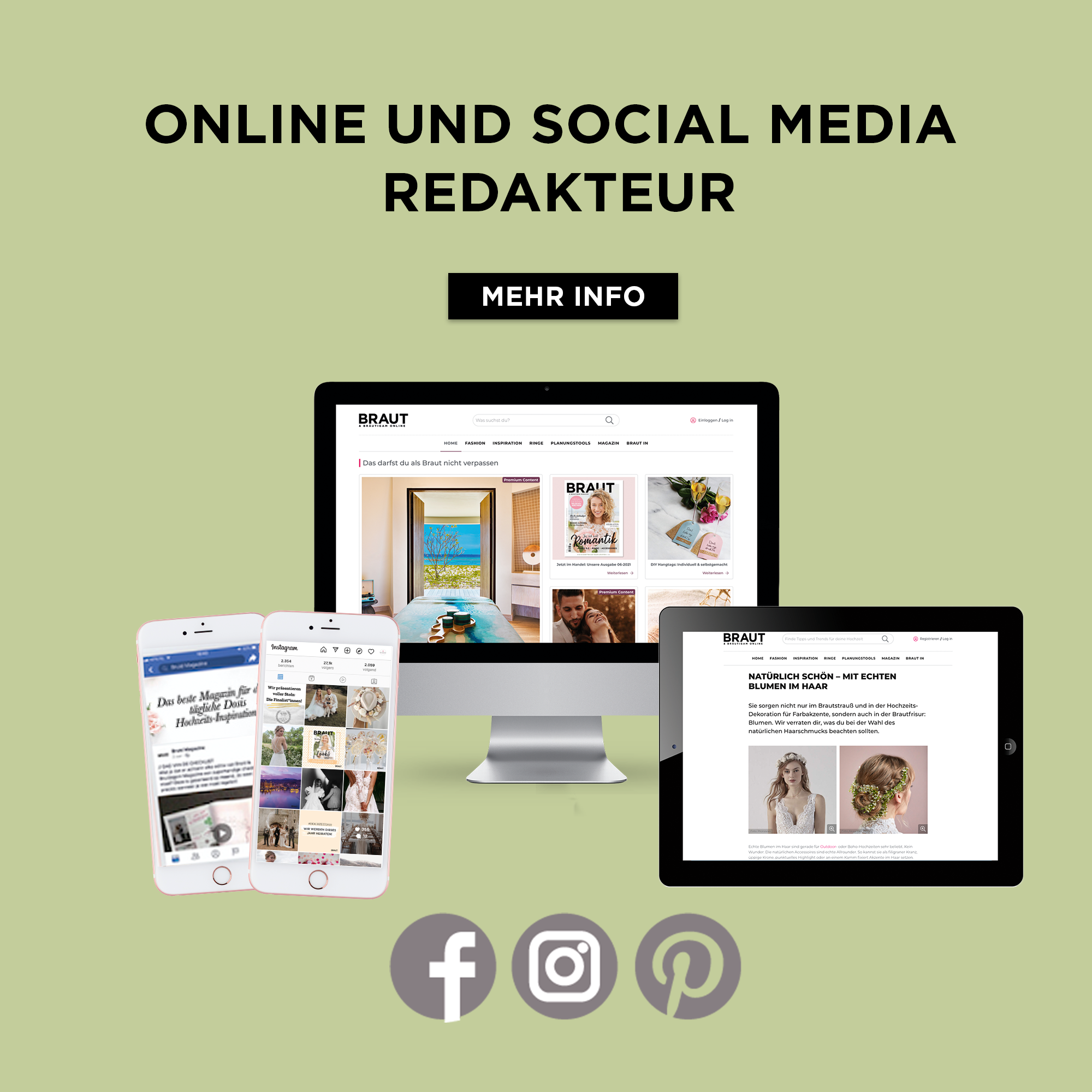 Braut Magazin ist das führende Hochzeitsmagazin in Österreich. Als Teil von Brautmedia inspirieren und informieren wir jedes Jahr zehntausende heiratswillige Paare bei der Planung ihrer Traumhochzeit. Mit einer Kombination aus Print, Online und Social Media bieten wir eine umfassende Medienplattform, die Brautpaare von den ersten Ideen bis zum großen Tag begleitet. Zur Verstärkung unseres deutschen Teams suchen wir derzeit folgende KandidatInnen: